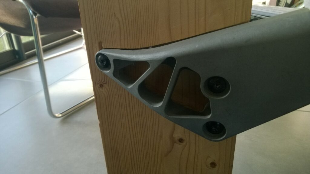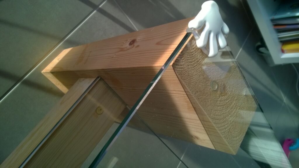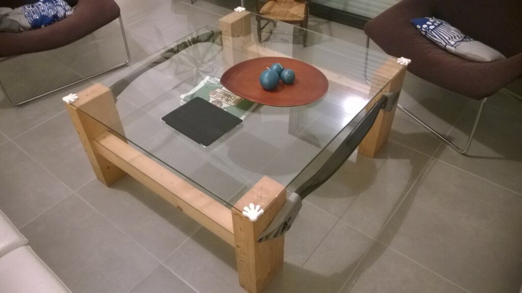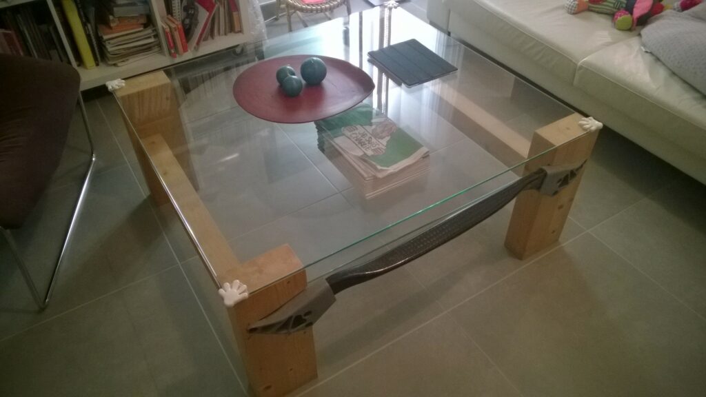 La particularité de cette table est le mariage entre le bois, le verre et l’aluminum avec comme contrainte 2 pièces automobiles qui servent aussi de traverse