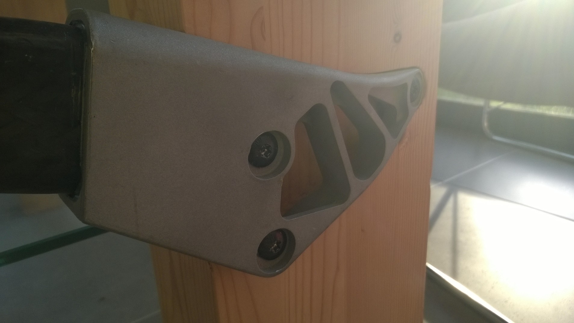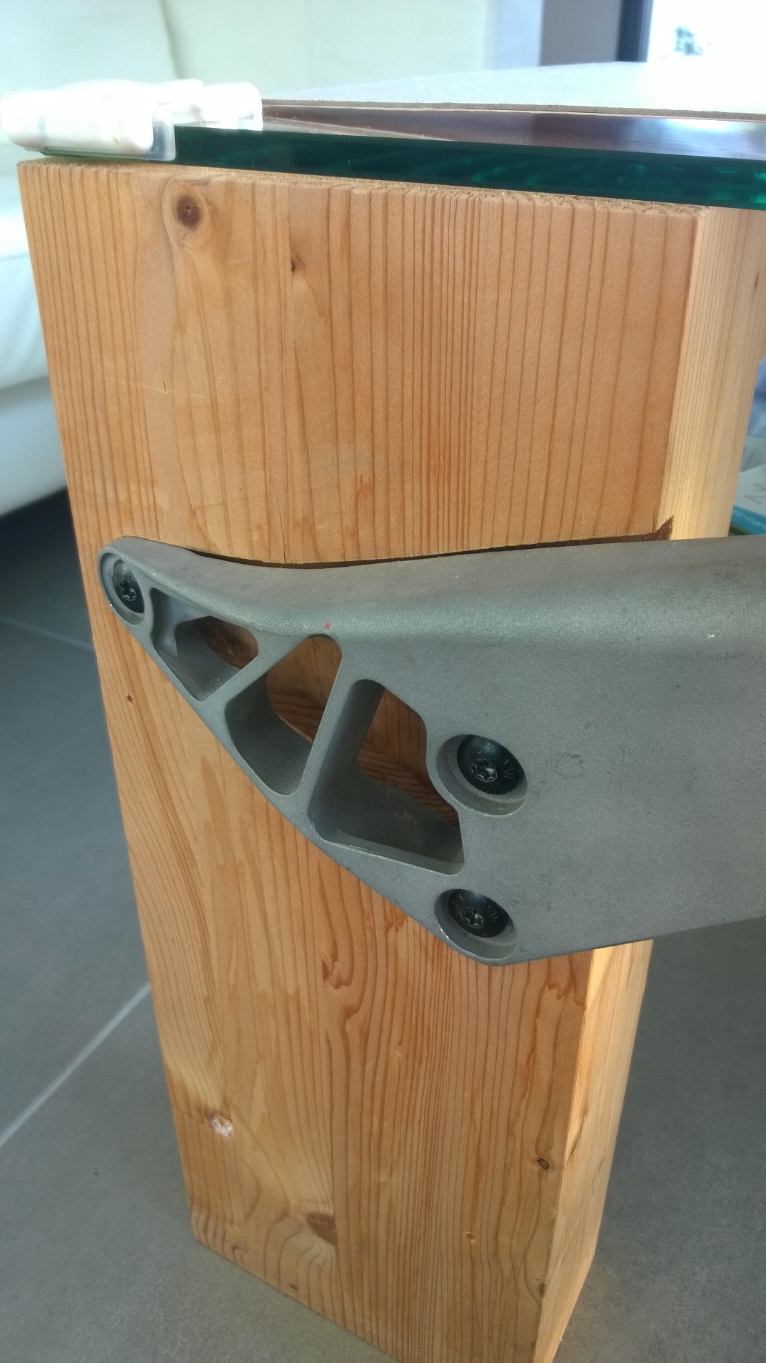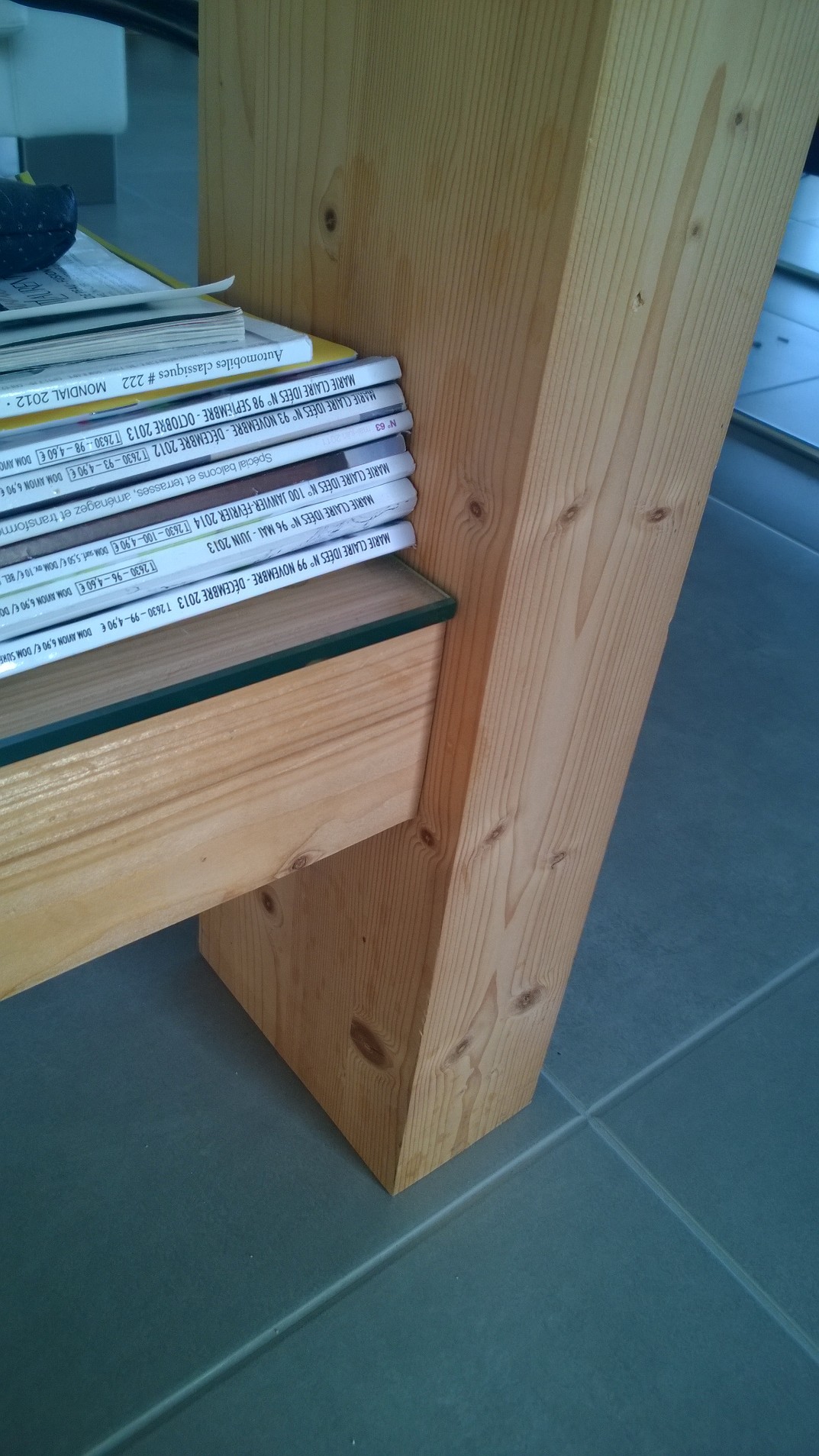 La particularité de cette table est le mariage entre le bois, le verre et l’aluminum avec comme contrainte 2 pièces automobiles qui servent aussi de traverse