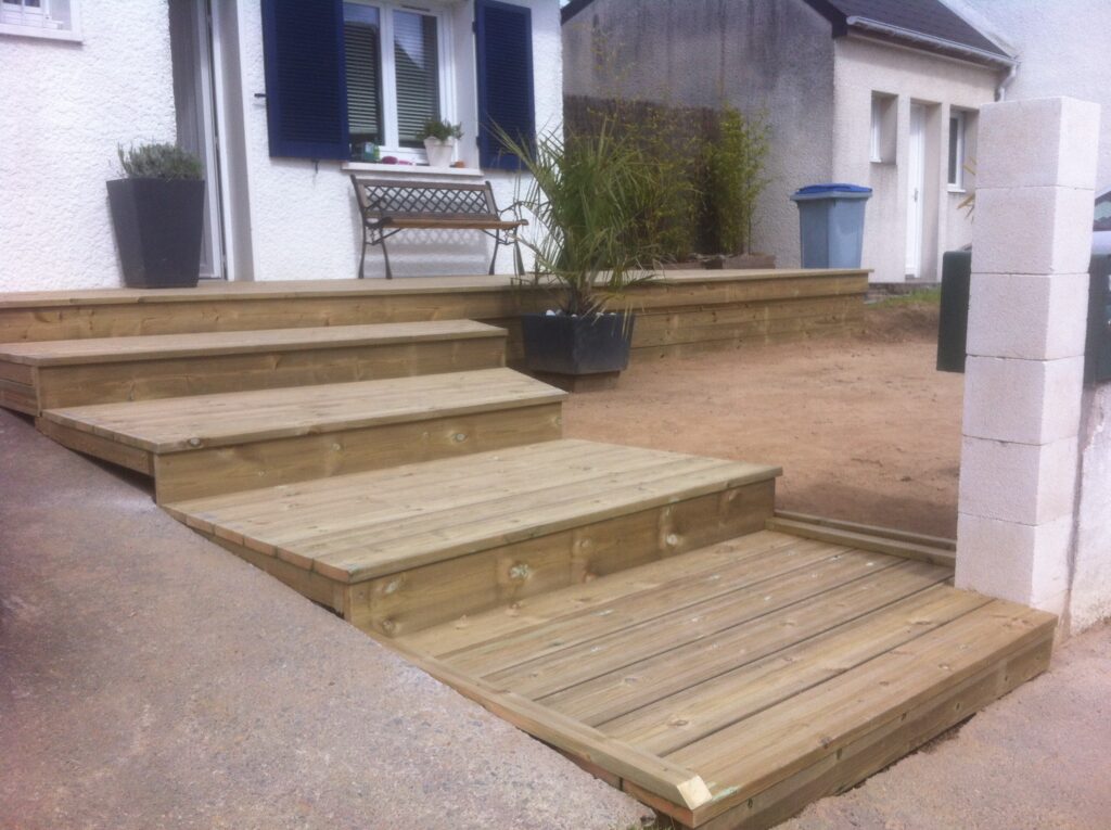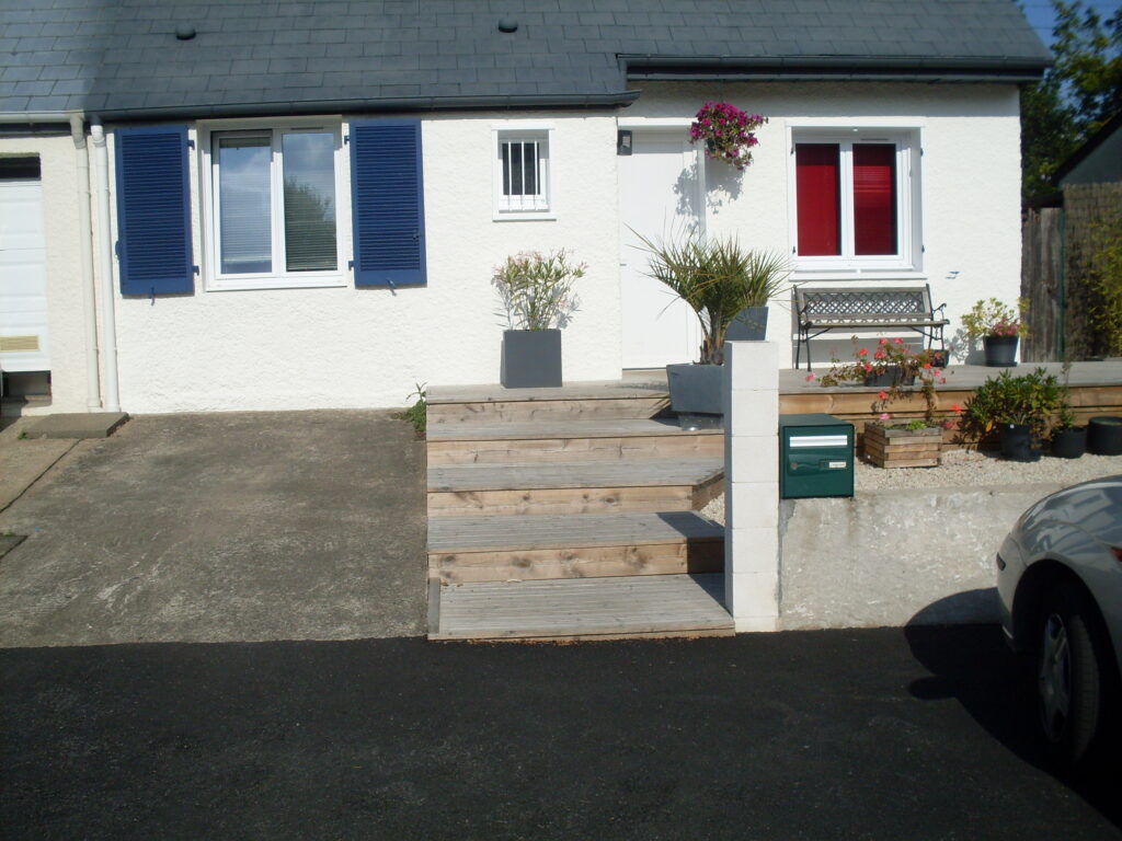 J’ai réalisé cette terrasse de 35m² en pin traité classe 4. Cette terrasse a été surélevée pour atteindre le niveau de la porte d’entrée et est accessible par un escalier à l’avant et à l’arrière de la maison