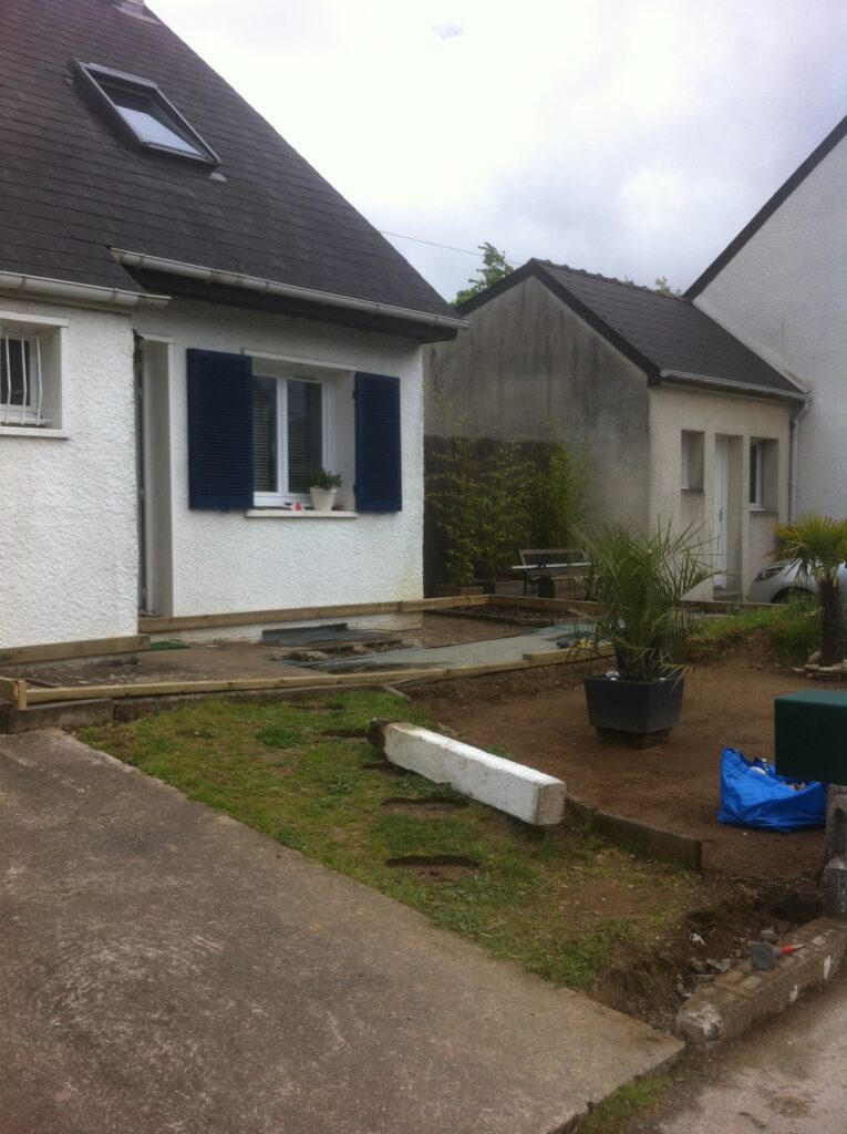 Cette terrasse est autoportée et repose sur des pieux en bois. La particularité de mes terrasses réside dans le fait que je n’utilise pas de béton.