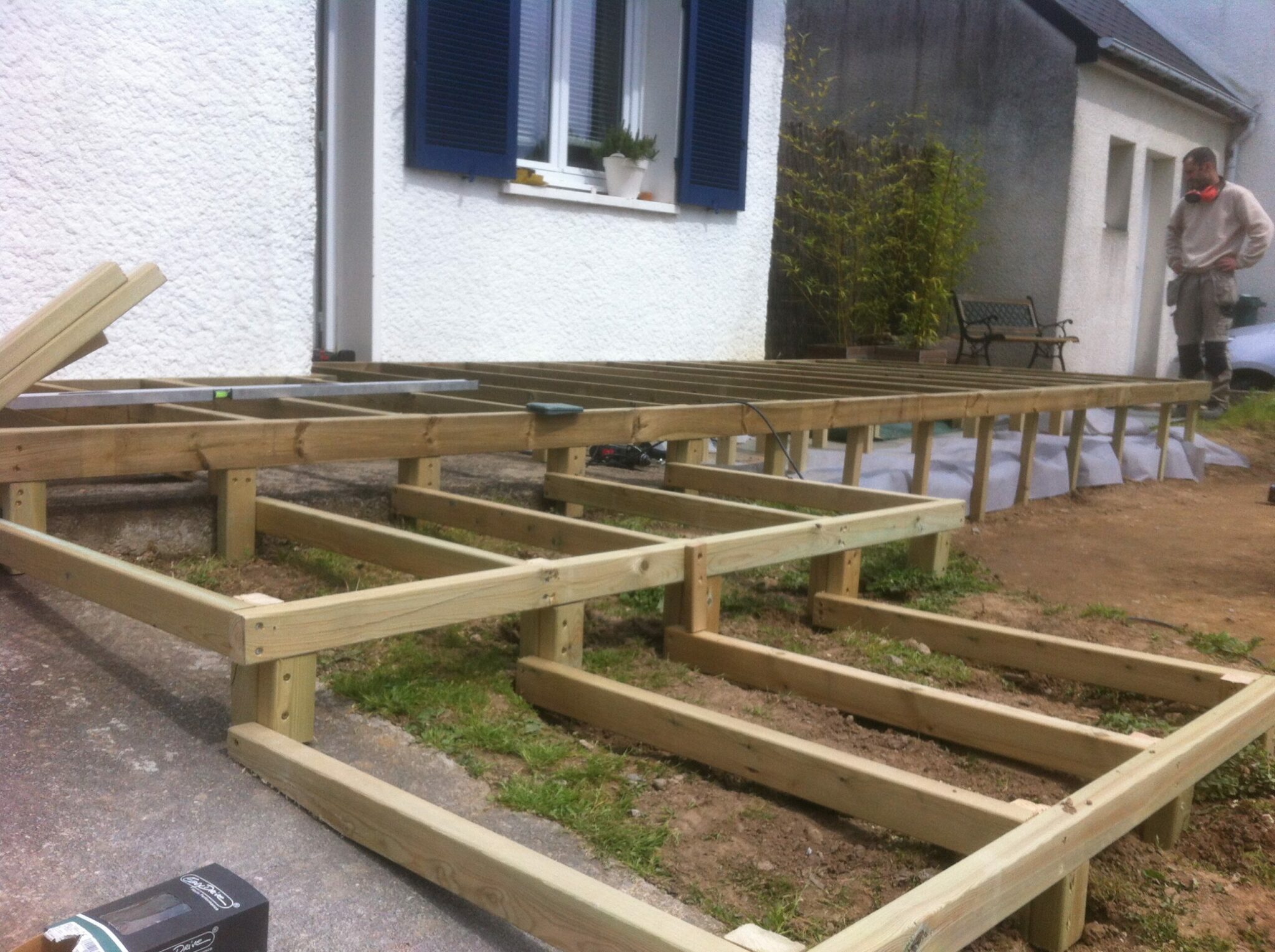 Cette terrasse est autoportée et repose sur des pieux en bois. La particularité de mes terrasses réside dans le fait que je n’utilise pas de béton.