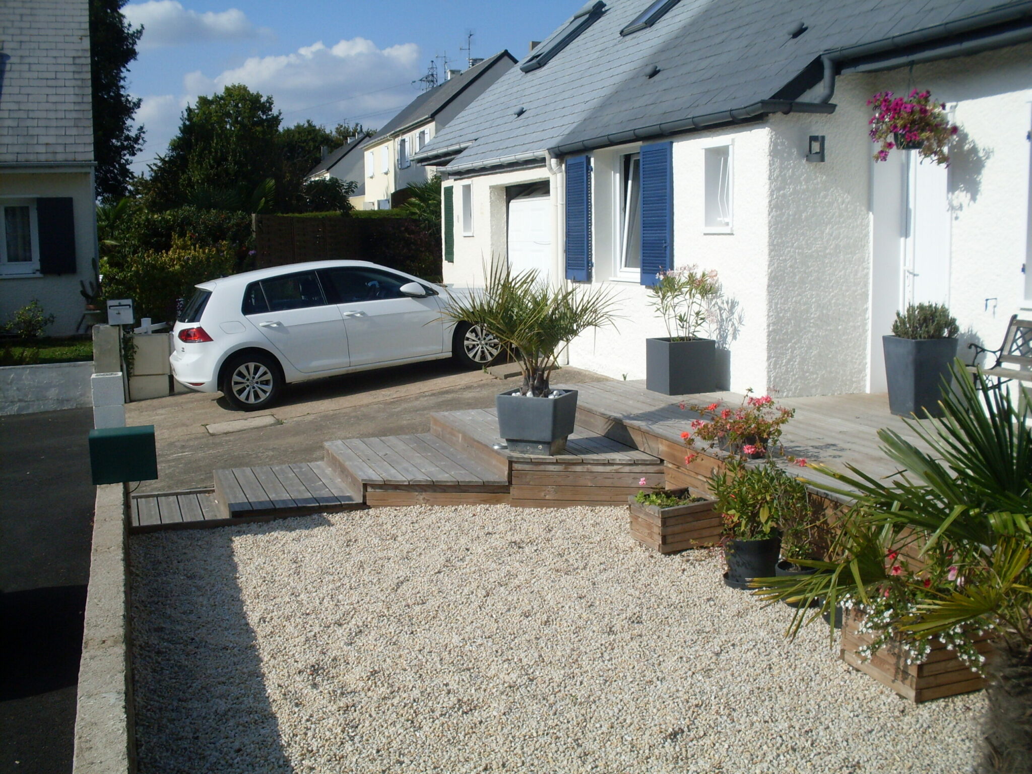 J’ai réalisé cette terrasse de 35m² en pin traité classe 4. Cette terrasse a été surélevée pour atteindre le niveau de la porte d’entrée et est accessible par un escalier à l’avant et à l’arrière de la maison
