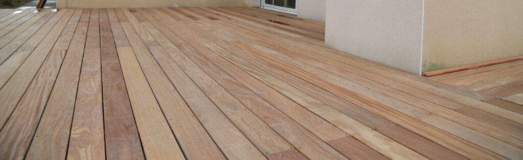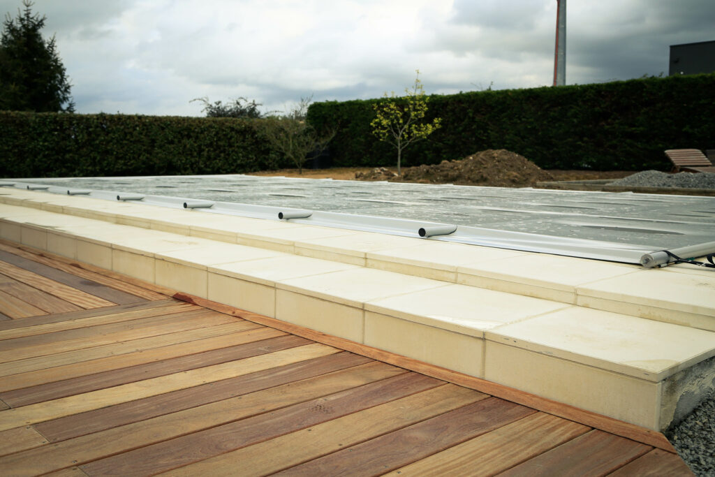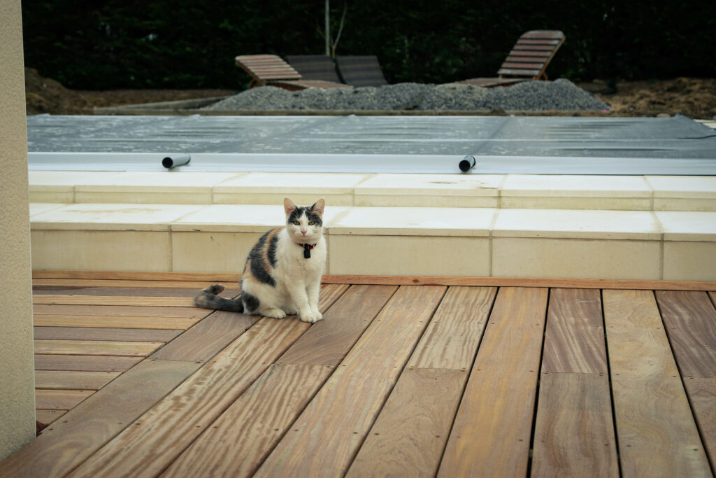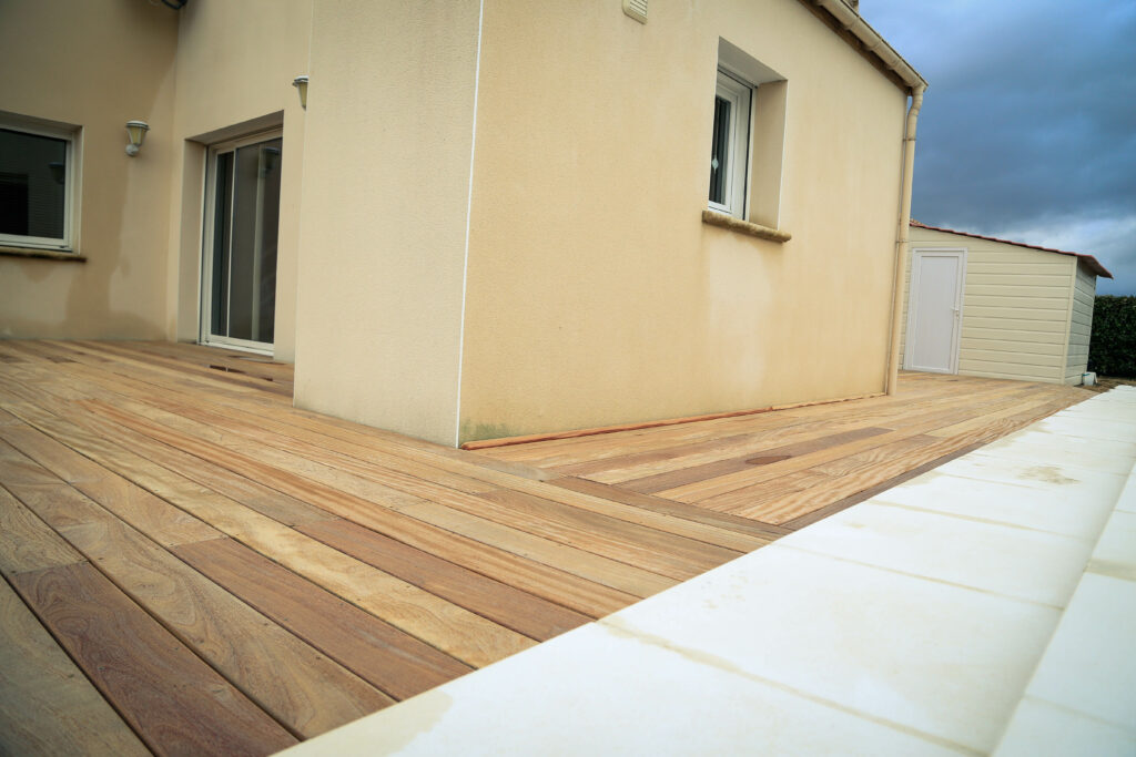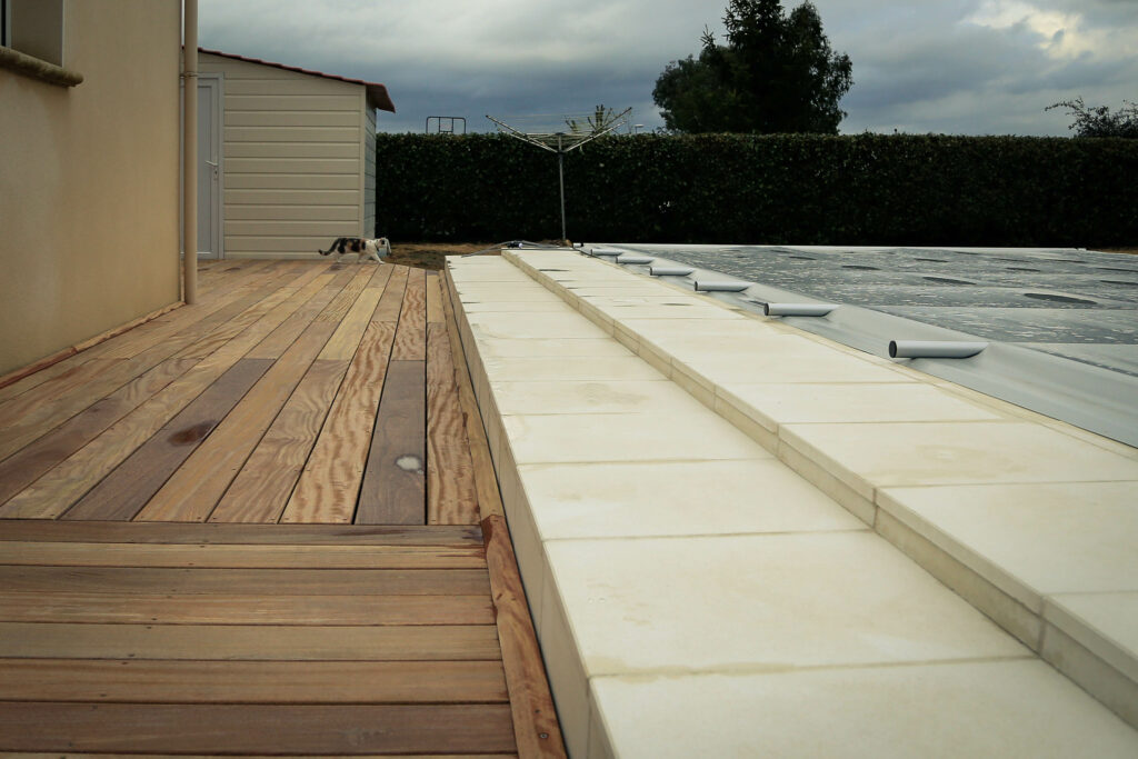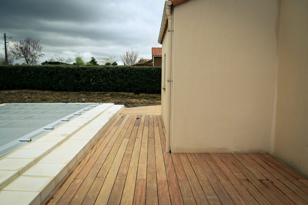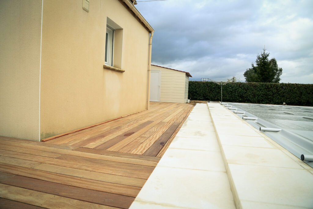 Terrasse sur mesure avec pourtour de piscine réalisée en cumaru.