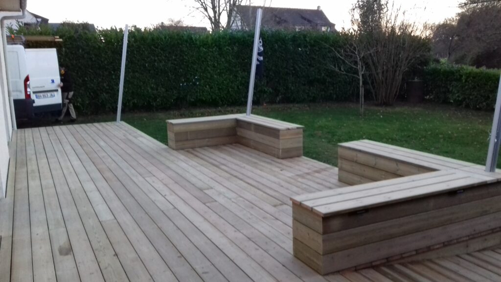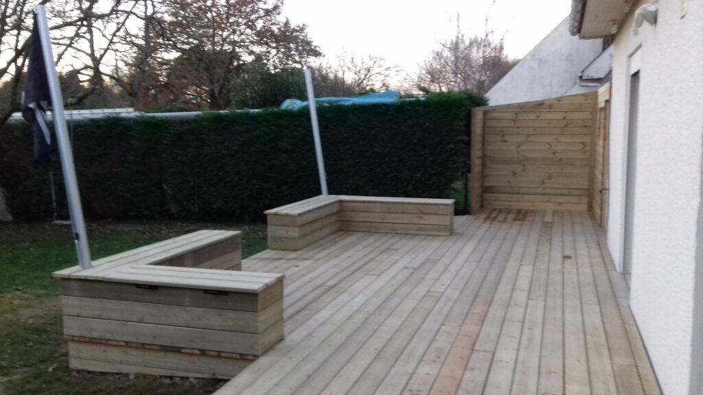 Création d’une terrasse de 50m² sur-mesure avec des bancs en bois.