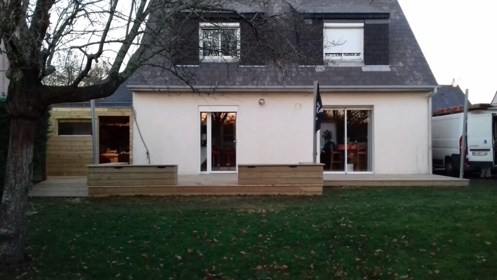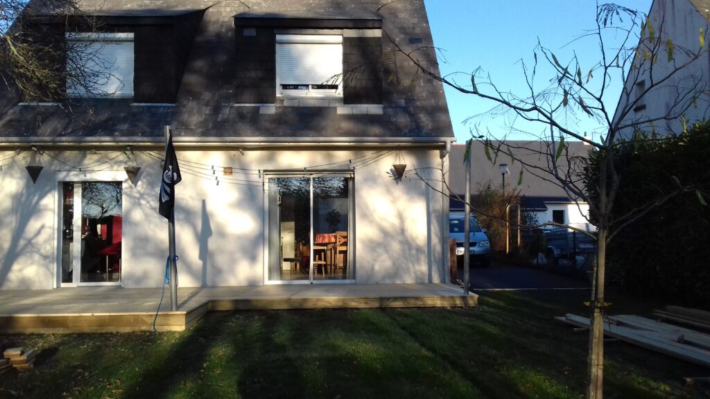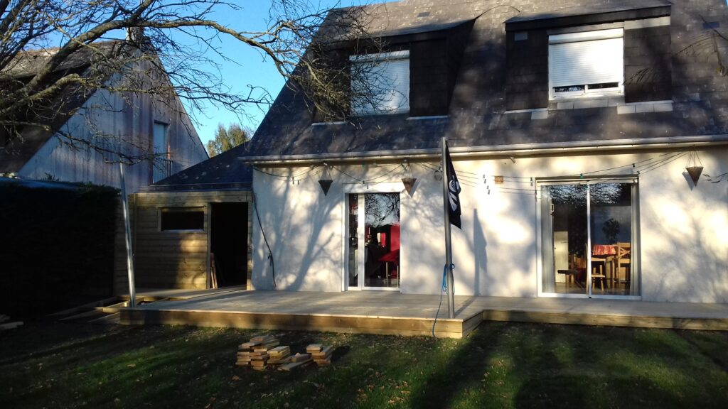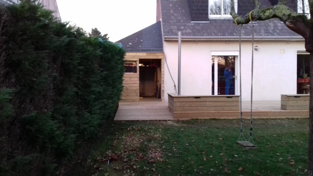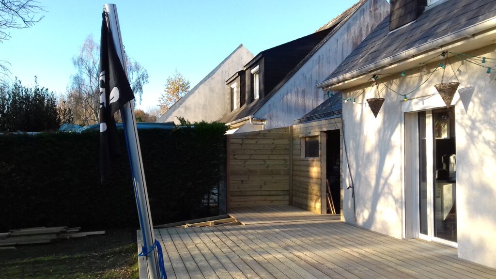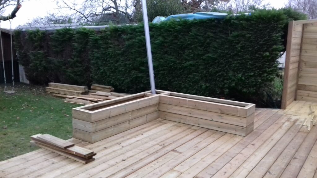 Réalisation d’aménagements de jardin en pin traité sue la commune du Temple de Bretagne au nord de Nantes.