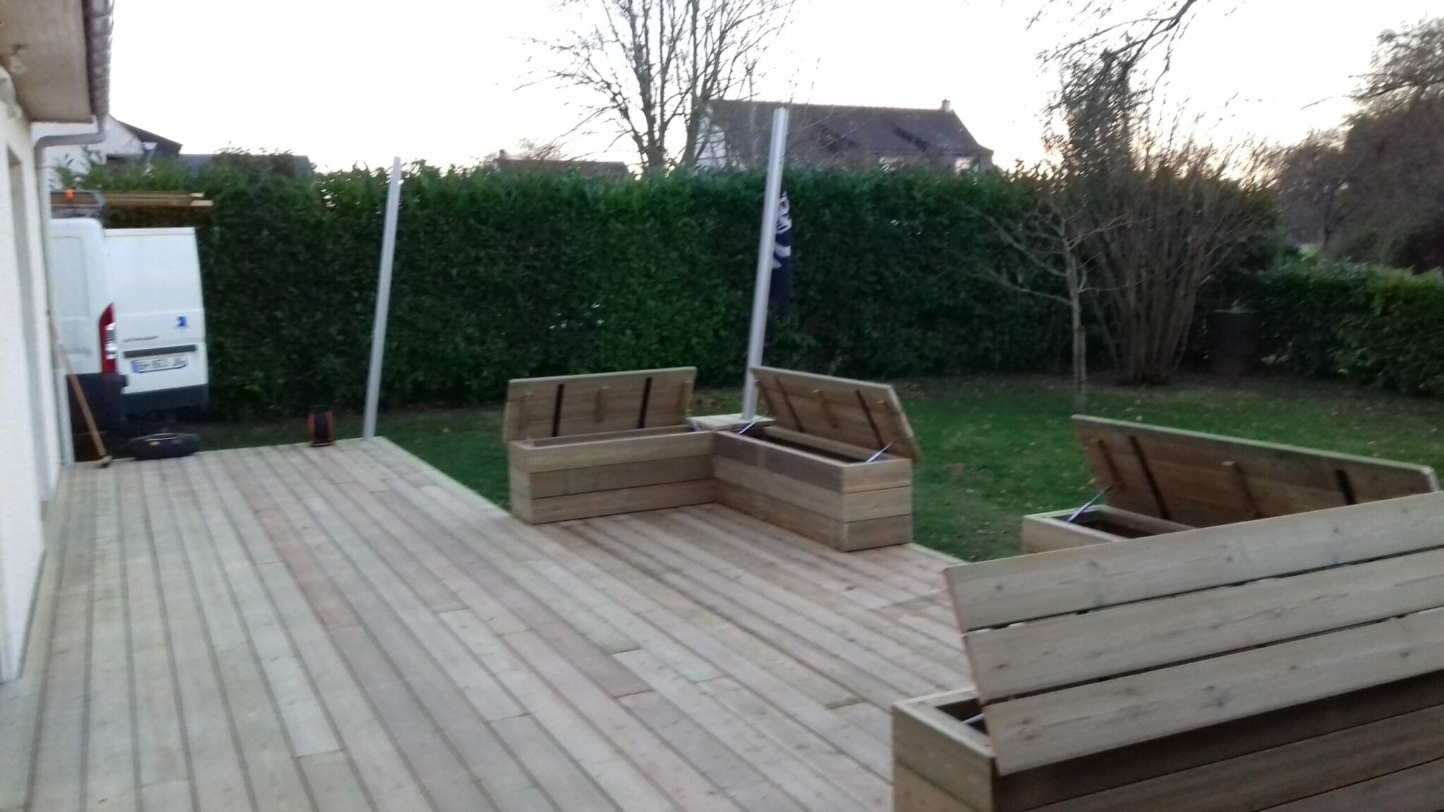 Création d’une terrasse de 50m² sur-mesure avec des bancs en bois.